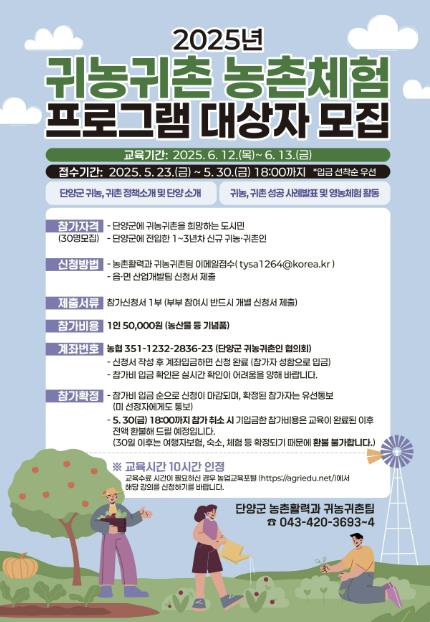 자세한 사항은 단양군 농촌활력과 귀농귀촌팀으로 문의하면 된다.