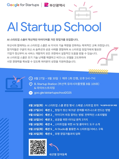 박 시장은 “부산시와 구글(Google for Startups)의 협력으로 진행하는 '스타트업 스쿨'이 올해는 인공지능(AI) 콘텐츠를 강화해 부산에서 선보이게 됐다”라며, “부산이 '아시아 창업도시'로 자리매김하기 위해 다양한 분야에서 역량을 집중하고 있는 만큼, 세계적인 기업과의 지속적인 협력을 통해 부산의 창업생태계 성장을 이끌어 나가겠다”라고 전했다.