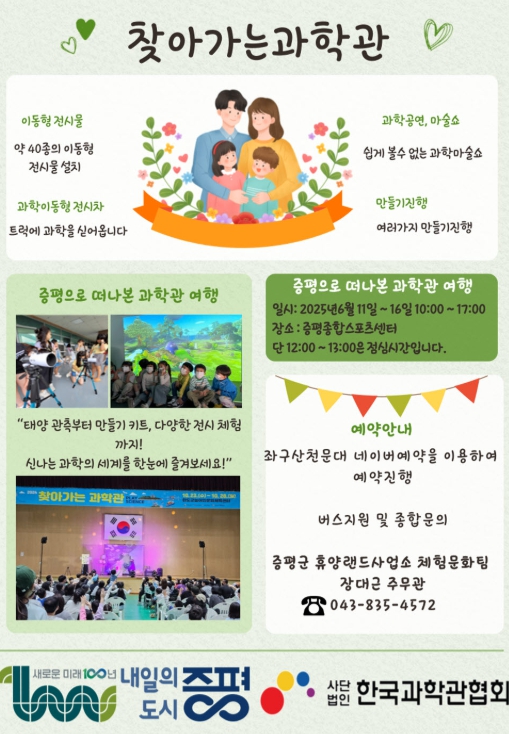 증평군은 오는 6월 11일부터 16일까지 6일간 증평종합스포츠센터에서 ‘찾아가는 과학관’을 운영한다고 밝혔다.