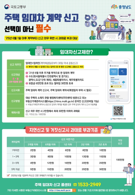 [무한뉴스=정민정 기자] 충남도는 ‘주택 임대차 계약 신고제’의 계도기간이 오는 31일 종료됨에 따라 6월 1일 이후 체결되는 계약부터 신고 의무 위반 시 과태료 부과가 본격 시행된다고 29일 밝혔다.