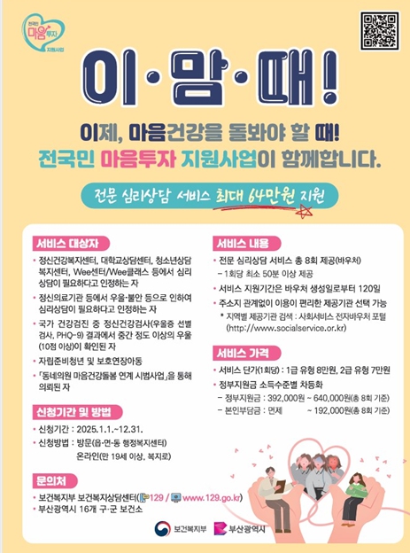 [무한뉴스=최진수 기자] 부산시는 우울·불안 등 정서적 어려움이 있는 시민에게 전문심리상담 서비스를 제공하는 '전국민 마음투자 지원사업'을 지난해에 이어 올해도 추진한다고 밝혔다.