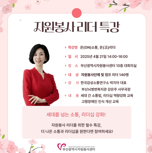 박경옥 부산광역시자원봉사센터장은“이번 특강이 단순한 교육을 넘어 지역사회의 긍정적인 변화와 지속 가능한 성장을 이끄는 출발점이 되기를 바란다”라며, “자원봉사 리더의 역할이 어느 때보다 중요한 시점인 만큼, 이번 특강을 통해 시민과 함께 호흡하고 모두를 아우를 수 있는 진정한 리더로 성장하길 기대한다. 많은 자원봉사 리더 여러분의 관심과 적극적인 참여를 부탁드린다”고 전했다.