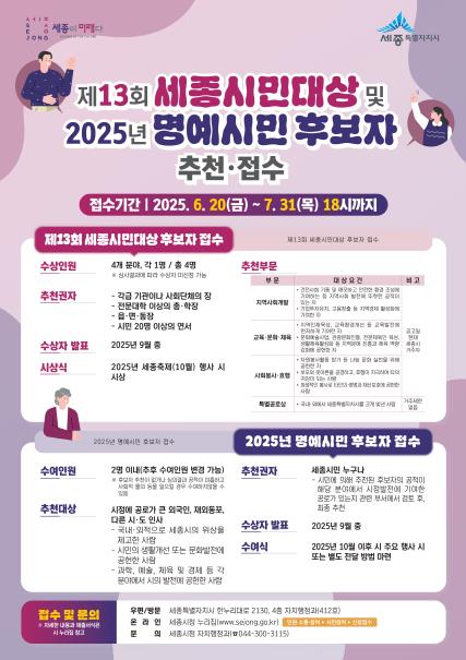 시는 20일부터 내달 31일까지 ‘제13회 세종시민대상’과 ‘2025년 명예시민’ 후보자 접수를 진행한다.