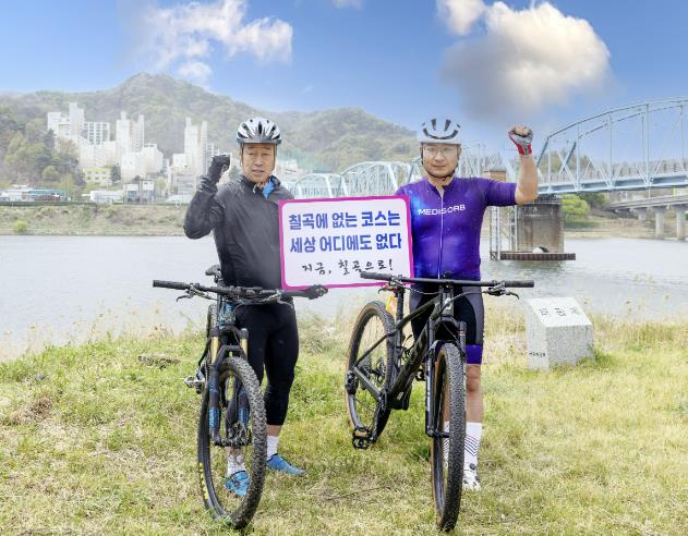 ▲ 김태경 칠곡군 사이클연맹 회장(왼쪽)과 김원일 원바이오젠 대표가 6·25전쟁 당시 북한군의 진격을 막기 위해 폭파했던‘호국의다리’아래에서 기념촬영을 하고 있다. 두 사람은‘칠곡에 없는 코스는 세상 어디에도 없다’는 문구가 적힌 피켓을 들고, MTB 성지로 떠오른 칠곡의 자전거 코스를 알리고 있다. |