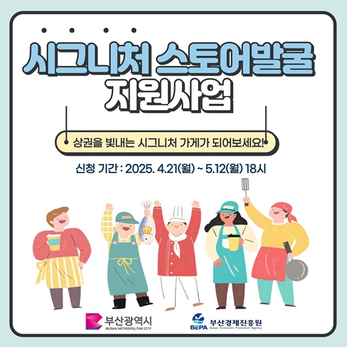 [무한뉴스=최진수 기자] 부산시는 오늘(21일)부터 5월 12일까지 지역 대표 점포를 통해 매력적인 상권을 조성하는 '2025년도 시그니처스토어 발굴 및 지원사업'에 참여할 소상공인을 모집한다고 밝혔다.