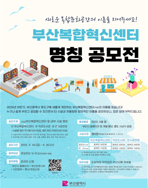 명칭 공모 대상은 ▲'(가칭)부산복합혁신센터'와 내부 시설인 ▲작은도서관 ▲전시공연장 총 3개다.