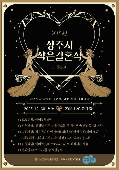 [무한뉴스=최진수 기자] 상주시는 2026년 작은결혼식 예비부부 6쌍을 2025년 12월 30일부터 2026년 1월 30일까지 모집한다.