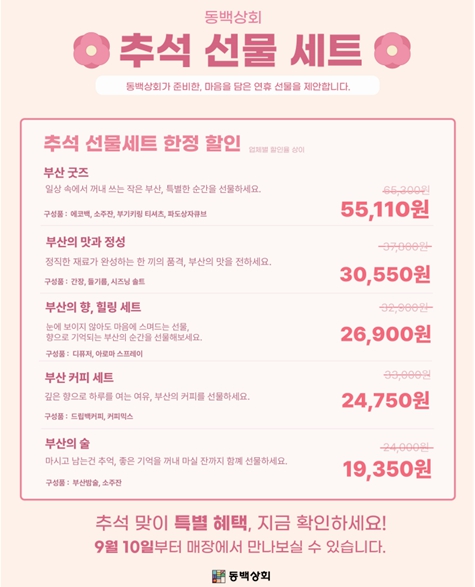 [무한뉴스=최진수 기자] 부산시는 부산 우수 제품 쇼핑 숍 '동백상회'에서 추석 명절을 앞두고 지역기업 제품으로 구성된 '선물 세트'를 출시해 오는 9월 30일까지 특별 할인 행사를 한다고 밝혔다.