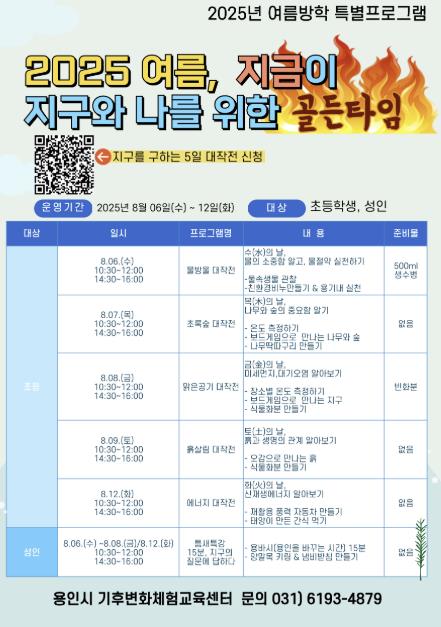 [무한뉴스=정윤식 기자] 용인특례시는 기후변화체험교육센터에서 기후환경 교육의 중요성을 배우고 실천할 수 있는 특별프로그램 ‘2025 여름, 지금이 지구와 나를 위한 골든타임’ 프로그램을 8월 6일부터 12일까지 운영한다고 5일 밝혔다.