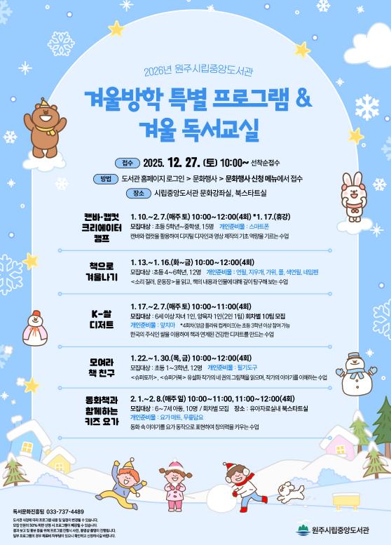 [무한뉴스=정민정 기자] 원주시립중앙도서관은 겨울방학을 맞아 유아부터 청소년을 대상으로 겨울방학 특별 프로그램과 겨울 독서교실을 운영한다.