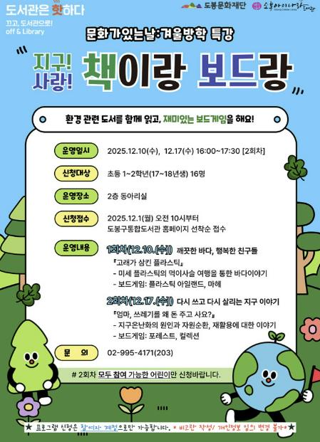[무한뉴스=정승훈 기자] 서울 도봉구 도봉아이나라도서관이 겨울방학 특별 프로그램으로 ‘책이랑 보드랑’을 운영한다.