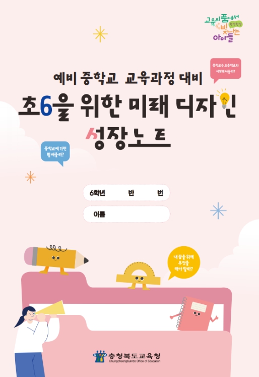 [무한뉴스=정승훈 기자] 충청북도교육청은 초등학교 6학년 학생들의 중학교 진학 준비와 진로 설계를 돕기 위해〈예비 중학교 교육과정 대비 초6을 위한 미래 디자인 성장노트'를 제작해 도내 모든 초등학교에 책자로 보급했다고 밝혔다.