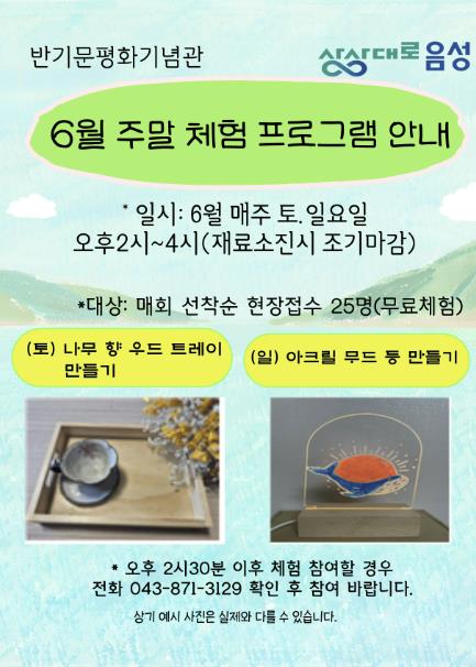 [무한뉴스=정민정 기자] 음성군 제8대 유엔사무총장 반기문 평화기념관에서는 관람객을 위한 ‘6월 주말 체험 프로그램’을 운영한다.