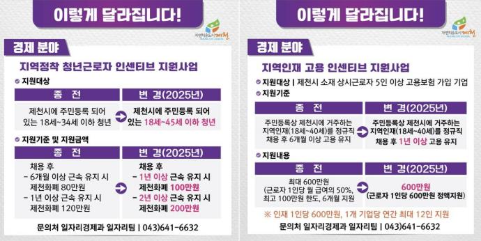 [무한뉴스=정민정 기자] 제천시가 청년인구의 유입과 장기근속을 극대화하고 내수 촉진 및 지역경제 활성화를 위해 추진하는 2025년도 『지역정착 청년근로자 인센티브 지원사업』과 『지역인재 고용 인센티브 지원사업』의 참여 신청 접수를 오는 6월 1일부터 10일까지 추진한다.