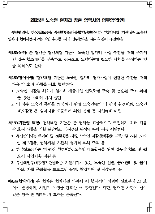 [무한뉴스=최진수 기자] 부산시는 오늘(25일) 오전 10시 시청 사회복지국장실에서 한국철도공사(부산경남본부), 부산희망등대종합지원센터와 '2025년 노숙인 일자리 창출 협력사업' 추진을 위한 업무협약을 체결한다고 밝혔다.