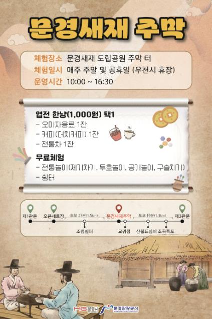 새재 주막은 과거 급제를 위해 문경새재를 오르다가 쉬어가던 옛 선비들의 삶을 모티브로 다양한 전통 체험을 할 수 있도록 기획된 주막 체험행사는 지난 2년간 매주 방문객들로부터 폭발적인 호응을 얻었다.