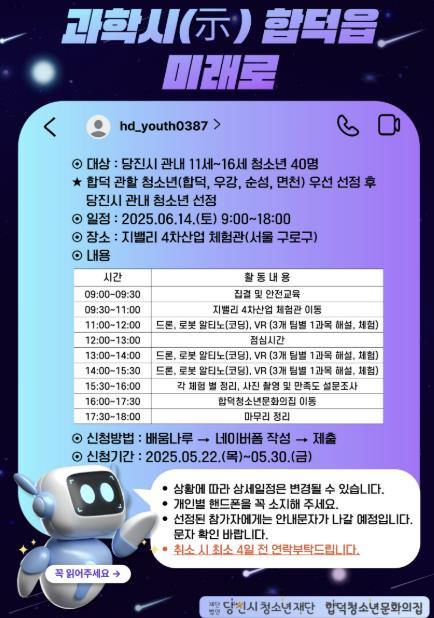 | ▲ 당진시 합덕청소년문화의집 4차산업 프로그램 과학시(示) 합덕읍 미래로 참가자 모집 |