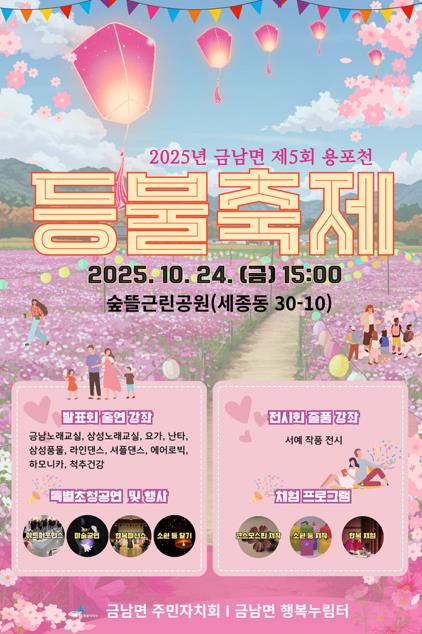 [무한뉴스=정민정 기자] 세종특별자치시 금남면 주민자치회가 24일 숲뜰근린공원 코스모스 꽃밭(세종동 30-10) 일원에서 ‘제5회 용포천 등불축제’를 개최한다.