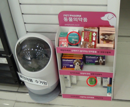 ▲ 약국 내 유효기한이 경과한 동물용의약품을 진열하고 있는 판매대 |