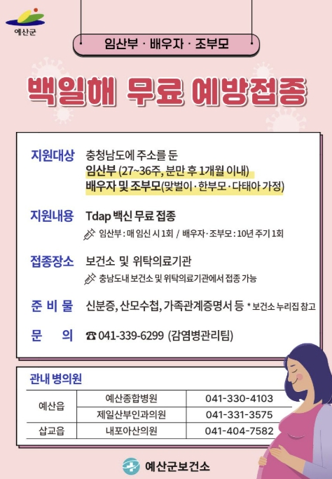 예산군, 임산부·배우자 백일해 무료 접종 대상 조부모까지 확대