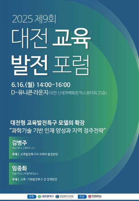 [무한뉴스=정민정 기자] 대전시는 대전시교육청과 공동으로 오는 6월 16일 오후 2시, 대전 엑스포타워 20층에 위치한 D-유니콘라운지에서 ‘제9회 대전교육발전포럼’을 개최한다.
