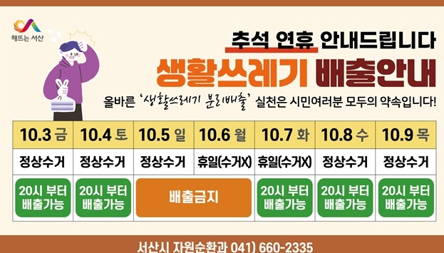 시는 추석 연휴 생활 쓰레기 수거 일정을 10월 10일까지 서산시 누리집, 중앙호수공원 전광판, 서산시 사회관계망서비스 등을 통해 시민에게 홍보할 계획이다.