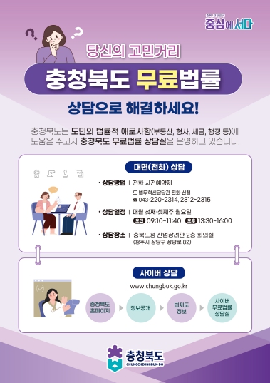 한편, 충북도는 『대면‧전화 무료법률상담실』을 통하여 올해 현재까지 162건의 상담을 실시하며 도민들의 많은 호응을 얻었다. 매월 첫째·셋째주 월요일 충북도청 산업장려관 2층 회의실에서 진행되는 대면·전화 무료법률상담을 받기 위해서는 도 법무혁신담당관(☏ 043-220-2314, 2312~2315)을 통하여 사전예약을 하면 된다.