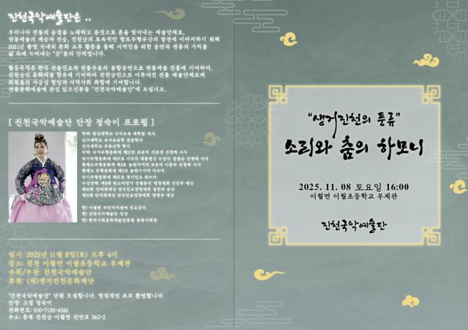[무한뉴스=정민정 기자] (재)생거진천문화재단은 오는 11월 8일 오후 4시 이월초등학교 ‘무제관’에서 진천국악예술단이 ‘진천의 풍류, 소리와 춤의 하모니’ 공연을 개최한다고 20일 밝혔다.