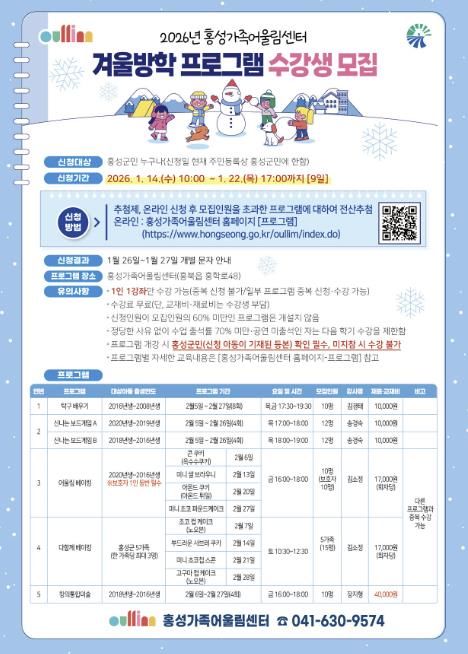 [무한뉴스=정민정 기자] 홍성가족어울림센터는 관내 유아 및 초·중·고등학생을 대상으로 2026년 겨울방학 프로그램 수강생을 모집한다. 이번 프로그램은 놀이 중심의 체험형 교육을 강화하고, 보호자와 함께 참여할 수 있는 수업을 포함해 가족이 함께 즐길 수 있는 문화 활동으로 구성됐다.