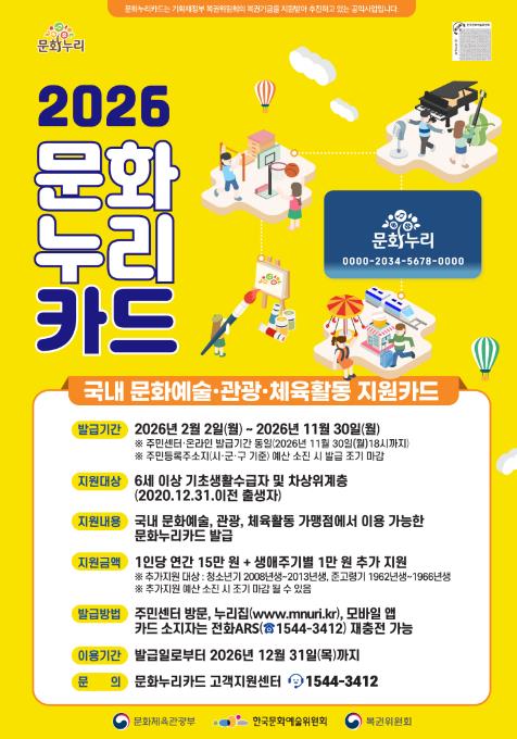 [무한뉴스=정민정 기자] 세종특별자치시가 내달 2일부터 소외계층의 문화 격차 해소를 위한 2026년도 문화누리카드 발급을 시작한다.