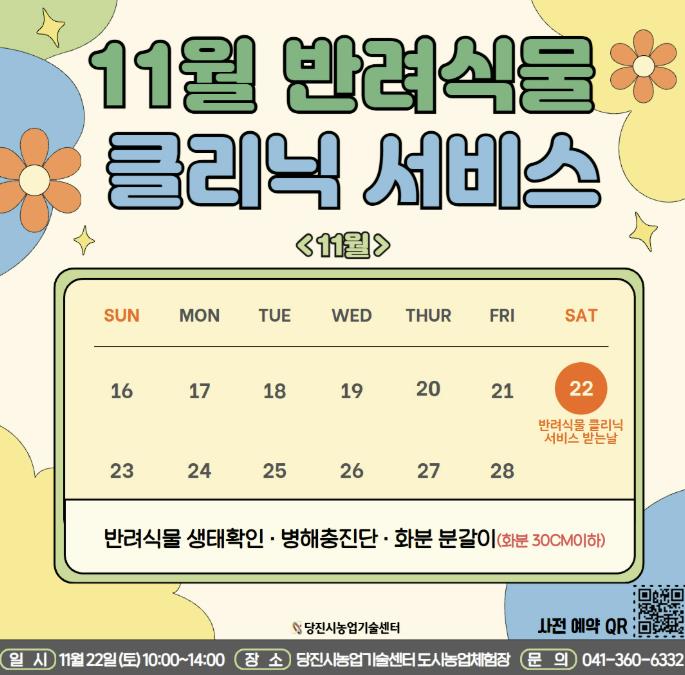 [무한뉴스=정민정 기자] 당진시농업기술센터는 시민들의 반려식물 관리 역량을 높이고, 도시농업의 저변 확대를 위해 오는 22일 오전 10시부터 오후 2시까지 농업기술센터 도시농업체험장에서‘반려식물 클리닉 서비스’를 운영한다고 18일 밝혔다.