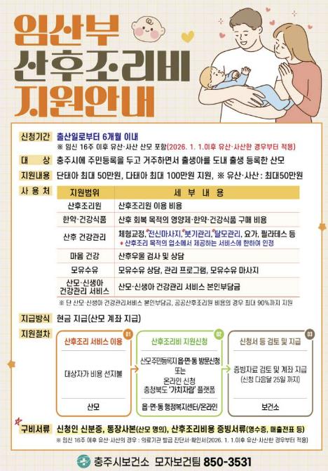 [무한뉴스=정민정 기자] 충주시는 출산과 양육에 대한 부담을 완화하고 산모의 신체적·정신적 회복을 지원하기 위해 산후조리비 지원 대상과 신청 방식을 확대한다고 15일 밝혔다.