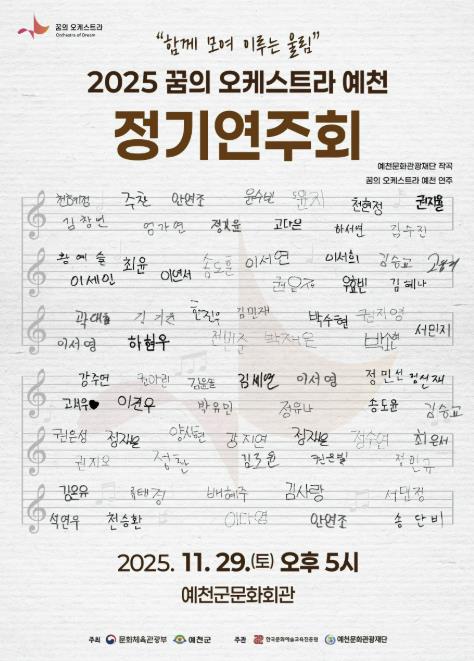 [무한뉴스=최진수 기자] 예천문화관광재단은 오는 29일 오후 5시, 예천군문화회관에서 '2025 꿈의 오케스트라 ‘예천’ 정기연주회 '함께 모여 이루는 울림''을 개최한다.