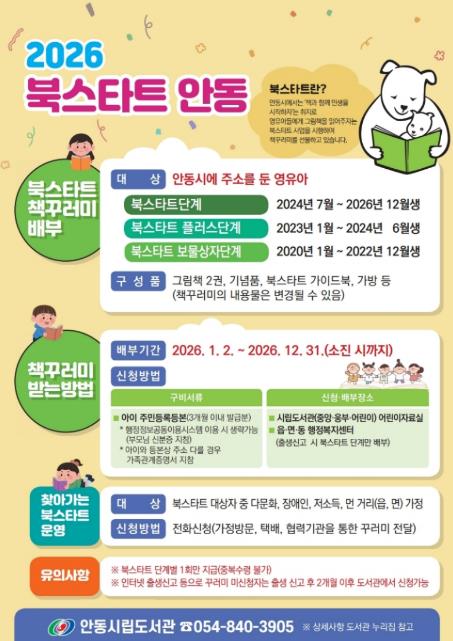 『북스타트 안동』은 영유아기부터 책과 친숙해질 수 있는 환경을 조성하고, 가정과 지역사회 전반에 책 읽는 문화를 확산하기 위해 아이들의 연령별로 책꾸러미를 지원하는 사업이다. 책꾸러미는 ▲1단계 ‘스타트’ (2024년 7월생~2026년 12월생) ▲2단계 ‘플러스’ (2023년 1월생~2024년 6월생), ▲3단계 ‘보물상자’ (2020년 1월생~2022년 12월생)로 구성되며, 각 단계별로 한 번만 수령할 수 있다.