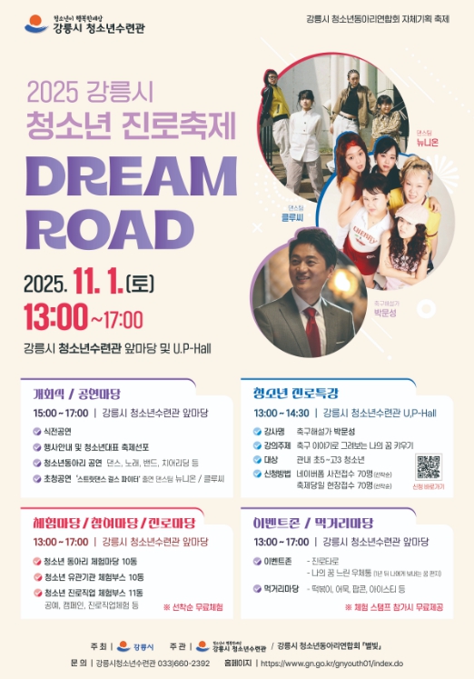 [무한뉴스=정민정 기자] 강릉시 청소년수련관은 오는 11월 1일 오후 1시부터 5시까지 강릉시 청소년수련관 앞마당 및 유피홀에서 청소년들의 진로 탐색과 자율적 참여 확대를 위한 2025 강릉시 청소년 진로축제 'Dream Road'를 개최한다.