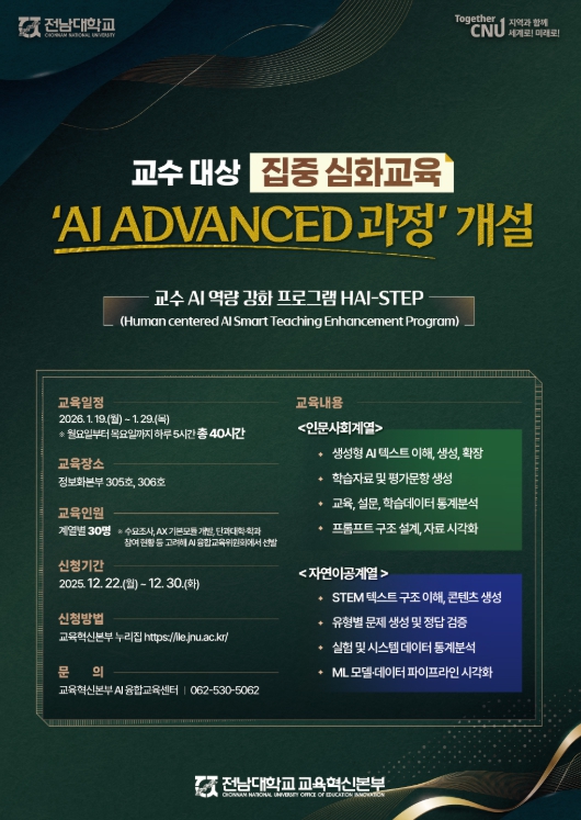 24일 전남대학교에 따르면, 전남대학교 교육혁신본부는 AI 대전환 시대에 선제적으로 대응하고 교수자의 AI 활용 역량을 강화하기 위해 ‘AI ADVANCED 과정’을 개설한다.