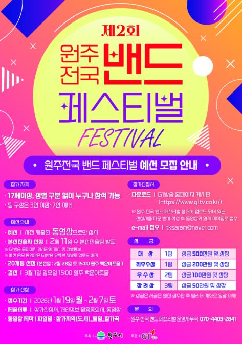 한편 지난해 열린 제1회 원주 전국 밴드 페스티벌 예선에는 총 186명이 참가해 전국 밴드들의 높은 관심과 열정을 확인할 수 있었다.