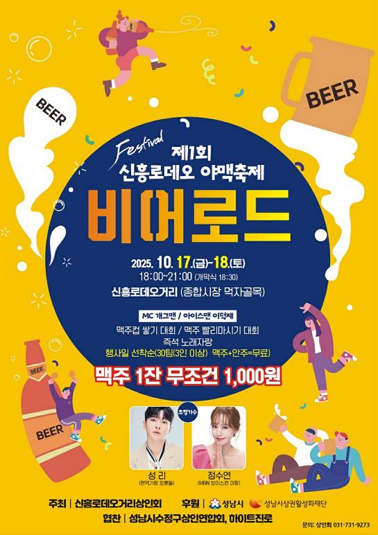 오는 17일과 18일 저녁 6시부터 9시까지 신흥로데오거리(종합시장 먹자골목)에서 열리는 ‘제1회 신흥로데오 비어로드 야맥축제’에서는 △맥주 빨리 마시기 대회 △맥주컵 쌓기 대회 △즉석 노래자랑 등 시민 참여형 이벤트가 다채롭게 진행된다. 특히 맥주는 소진 시까지 잔당 1000원에 판매될 예정으로, 많은 시민의 참여가 기대된다.
