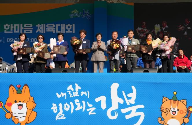 | ▲ 지난해 10월 열린 강북구민 한마음 체육대회에서 이순희 강북구청장(가운데)이 강북구민대상 수상자들과 기념촬영을 하고 있다. |