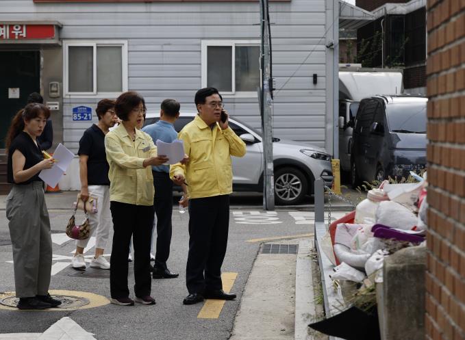 | ▲ 진교훈 강서구청장(오른쪽 첫 번째)이 6월 24일 복개도로 일대 쓰레기 무단 적치 현장을 확인하고 관련 부서에 즉각적인 조치를 지시하고 있다. |
