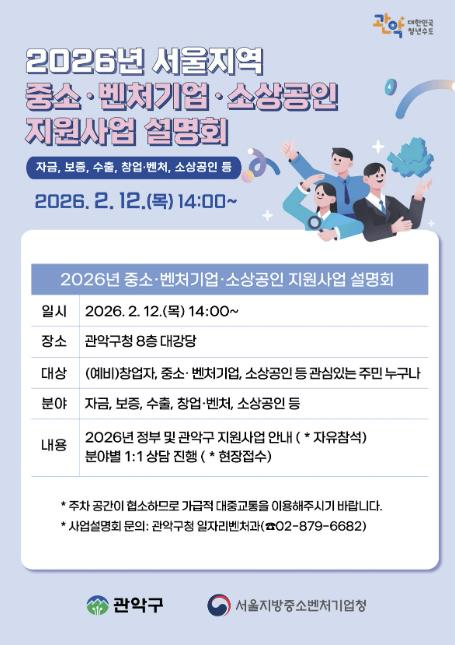 [무한뉴스=정승훈 기자] 관악구가 지역 경제의 주축인 중소·벤처기업과 소상공인의 경영 안정을 돕고, 혁신 성장의 발판을 마련하기 위한 대규모 정책 소통의 장인 오는 12일(목) 14시 관악구청 8층 대강당에서 ‘2026년 중소벤처기업·소상공인 지원사업 설명회’를 개최한다.