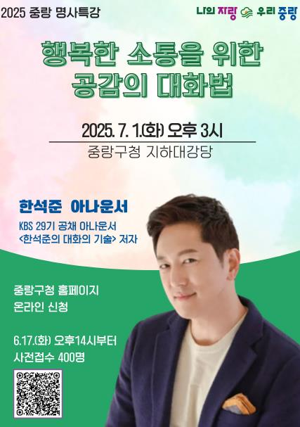[무한뉴스=정승훈 기자] 중랑구가 오는 7월 1일, 오후 3시에 중랑구청 지하대강당에서 ‘행복한 소통을 위한 공감의 대화법’을 주제로 명사특강을 개최한다.
