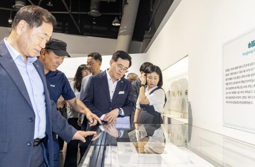 | ▲ 진교훈 서울 강서구청장(오른쪽 두 번째)이 국립항공박물관에서 ‘김포공항과 더불어 살아온 사람들’이라는 주제로 열린 ‘공항과 마을’ 특별전을 관람하고 있다. |
