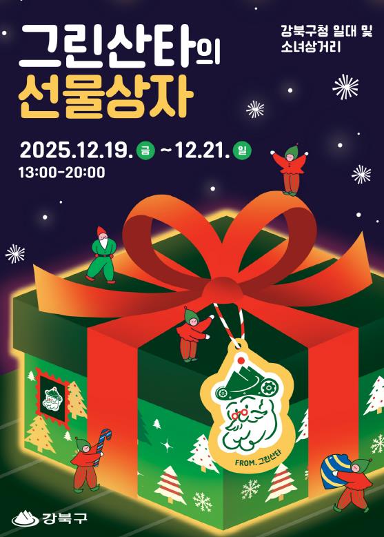 [무한뉴스=정승훈 기자] 서울 강북구는 오는 19일부터 21일까지 3일간 강북구청과 그 일대에서 2025 강북 크리스마스 마켓 ‘그린산타의 선물상자’를 개최한다고 밝혔다.
