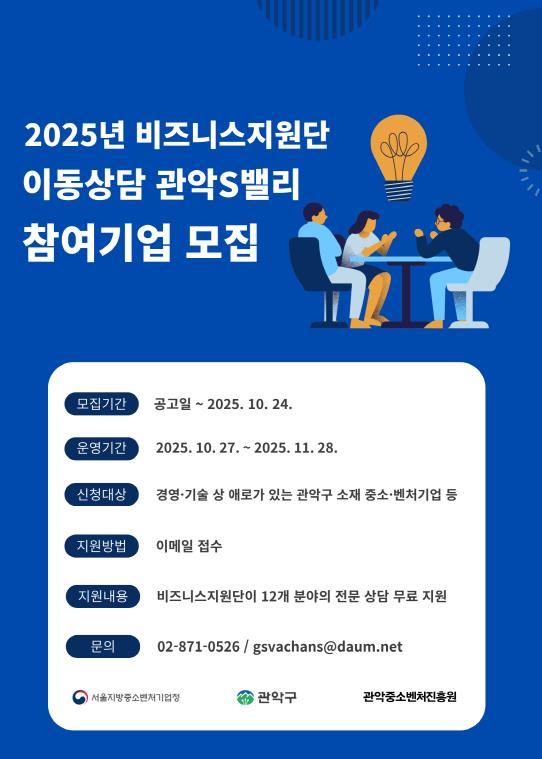 [무한뉴스=정승훈 기자] 관악구가 관악중소벤처진흥원과 서울지방중소벤처기업청이 협력하여 관내 창업기업의 애로사항 해소와 성장지원을 위한 '2025년 관악S밸리 비즈니스지원단 이동상담‘을 운영한다.