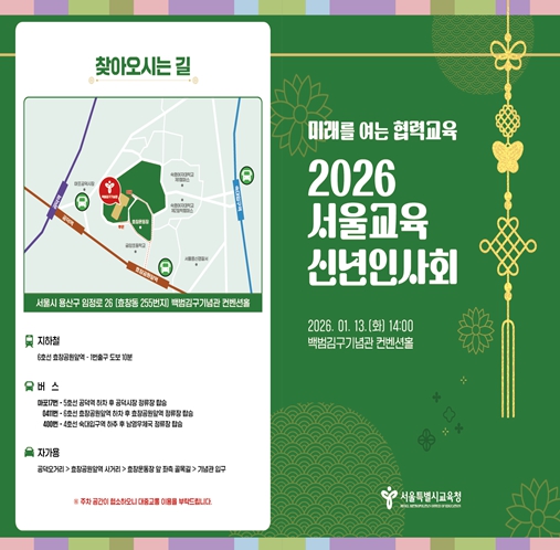 [무한뉴스=정승훈 기자] 서울특별시교육청은 오는 1월 13일에 용산구 백범김구기념관 컨벤션홀에서 ‘2026년 서울교육 신년인사회’를 개최한다.