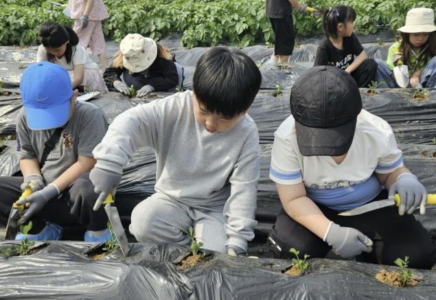 | ▲ 5월 28일 모종심기 체험을 하고 있는 포리초등학교 학생들 |