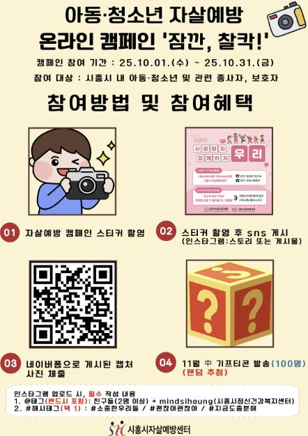 [무한뉴스=정승훈 기자] 시흥시자살예방센터는 오는 10월 1일부터 31일까지 한 달간 아동ㆍ청소년을 대상으로 생명존중 인식 확산 캠페인을 운영한다. 이번 캠페인은 아동ㆍ청소년이 심리적 지지를 얻고 생명의 소중함을 되새기도록 돕는 한편, 이를 누리소통망(SNS)을 통해 또래와 나눌 수 있도록 마련됐다.