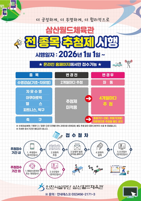 [무한뉴스=정승훈 기자] 인천시설공단은 내년 1월부터 삼산월드체육관, 계산국민체육센터와 송림체육관 스포츠센터 회원의 수영, 헬스 및 생활체육 등 모든 프로그램의 접수 방식을 기존 선착순제에서 추첨제로 변경하여 운영한다.