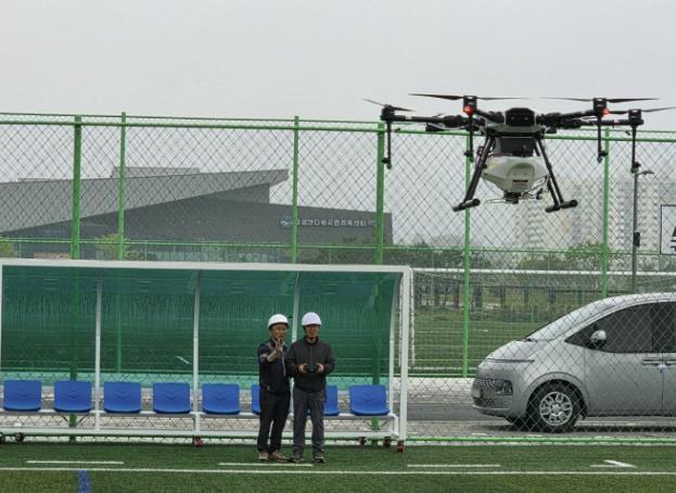 이후 음성생활체육공원 축구장에서 항공방제를 위한 드론의 속도 및 작물과의 높이, 방제 비행 패턴 등을 실습했다.